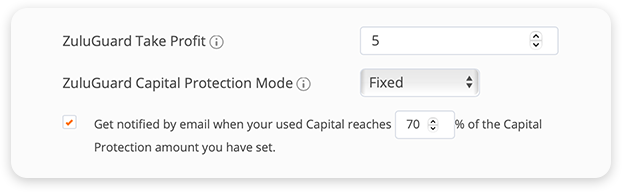 Example: You set ZuluGuard Capital protection at $1500 and you set the notification option at 50%. If the used capital for your Trader reaches 50% (- $750) of the Capital Protection amount you have set ($1500), you will receive an email inviting you to monitor closely your account and ZuluGuard Settings for this Trader.